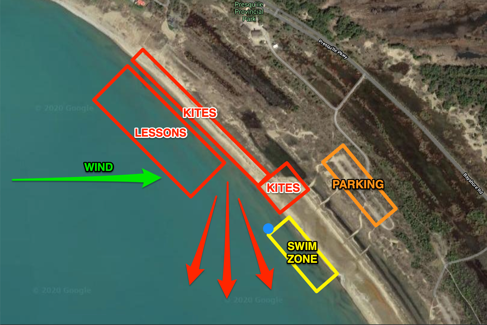 Presqu'ile has a kiteboarding zone at the north end of Beach 1. In the water, the kiteboarding zone is marked by a blue buoy. South of the buoy is the swimming zone. Kiters must launch their kites from the designated area and ride upwind past the buoy before heading out into the lake.